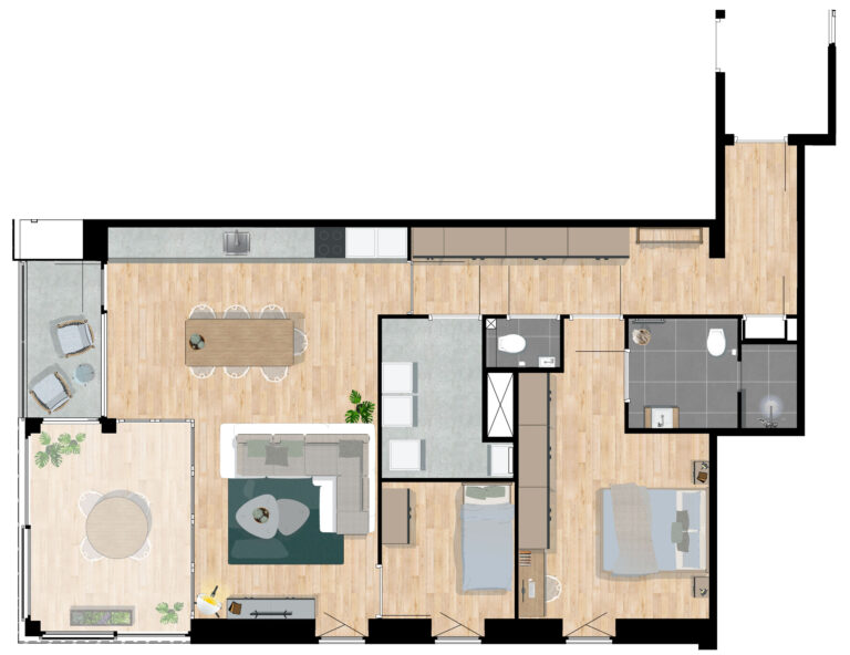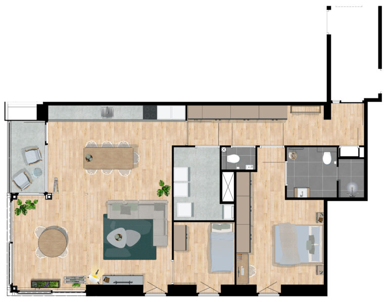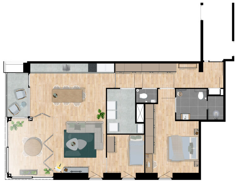 Appartement 04 is een royaal en comfortabel appartement met een doordachte indeling en hoogwaardige afwerking. Dankzij de ligging geniet je van veel licht, comfort én een mooie verbinding met de groene en waterrijke omgeving.
