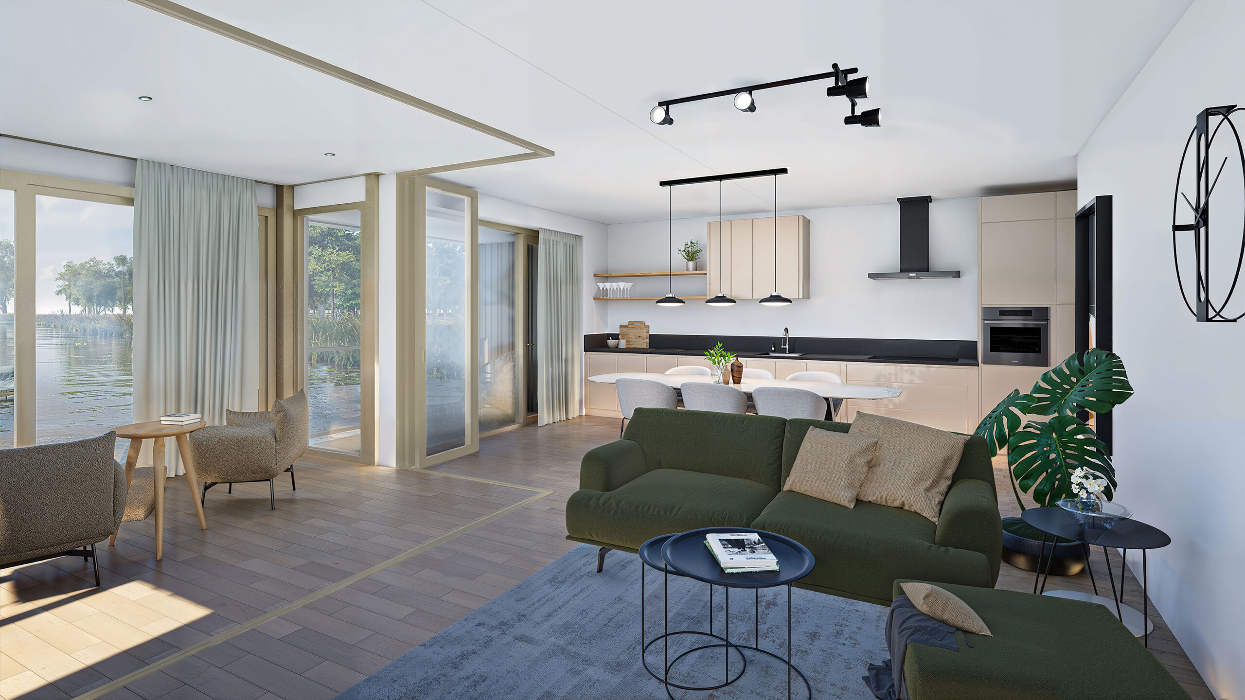 De ruime woonkamer loopt naadloos over in de seizoenserre, waar je het hele jaar door kunt genieten van extra leefruimte. De luxe keuken en complete badkamer zijn al inbegrepen, net als vloerverwarming en -koeling. Zo woon je comfortabel en duurzaam, zonder dat er meerwerk nodig is.